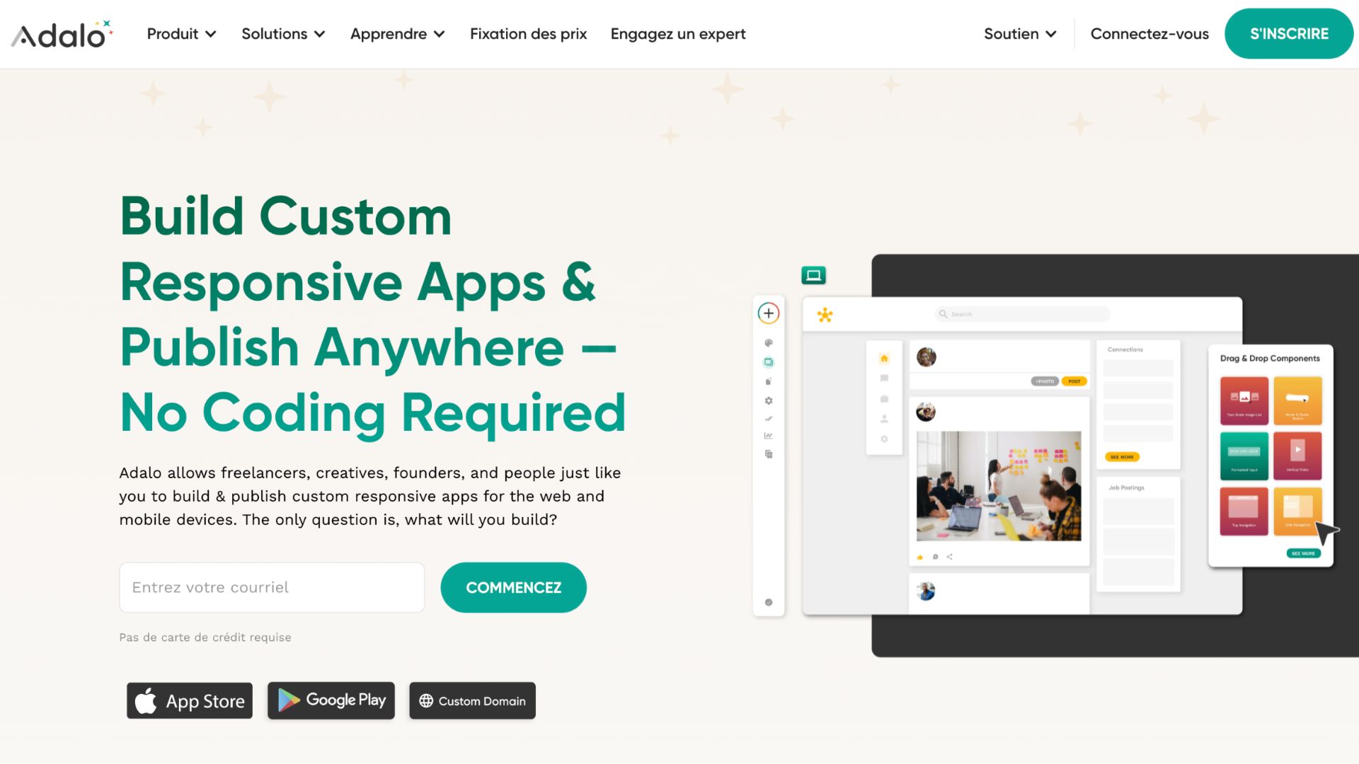 Adalo est un outil révolutionnaire qui permet de développer des applications mobiles natives sans aucune connaissance du code. Grâce à son interface de type « glisser-déposer », la création d'applications devient un jeu d'enfant. Vous pouvez concevoir votre application à partir d'une cinquantaine de composants disponibles qui sont simple à utiliser pour créer une interface responsive pour l'application mobile.