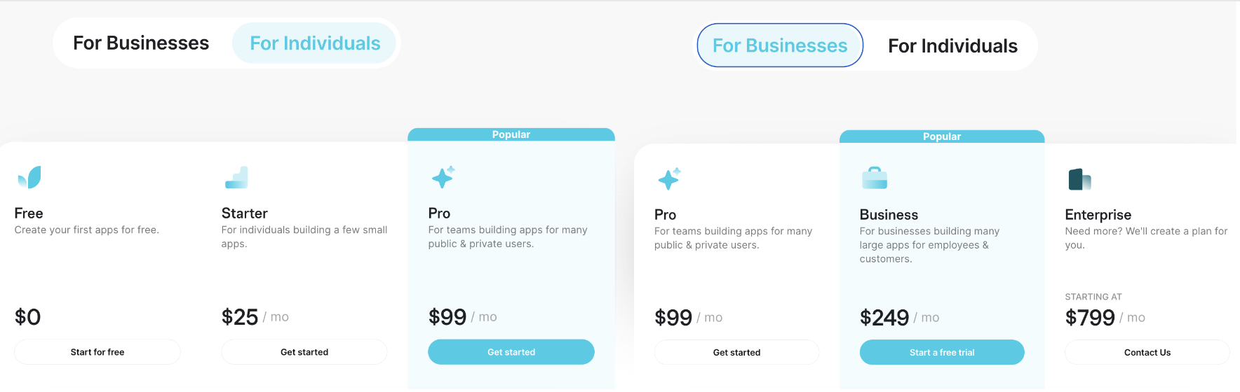 En ce qui concerne les trois plans avec des prix individuels, le plan gratuit est une excellente option pour les débutants qui cherchent à créer leur première application. Le plan "Starter", quant à lui, est destiné à ceux qui souhaitent créer quelques petites applications pour un coût mensuel de 25 $.