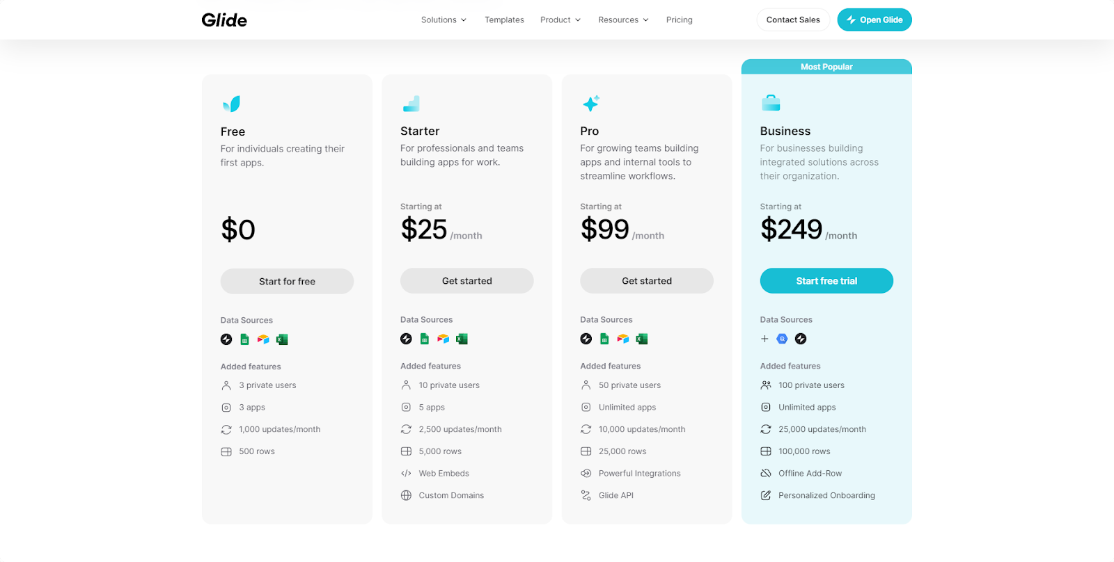Glide propose quatre formules d'abonnement. La première est gratuite et permet d'ajouter 3 utilisateurs privés, 3 designs d'applications, d'effectuer jusqu'à 1 000 mises à jour et d'obtenir jusqu'à 500 lignes de données.