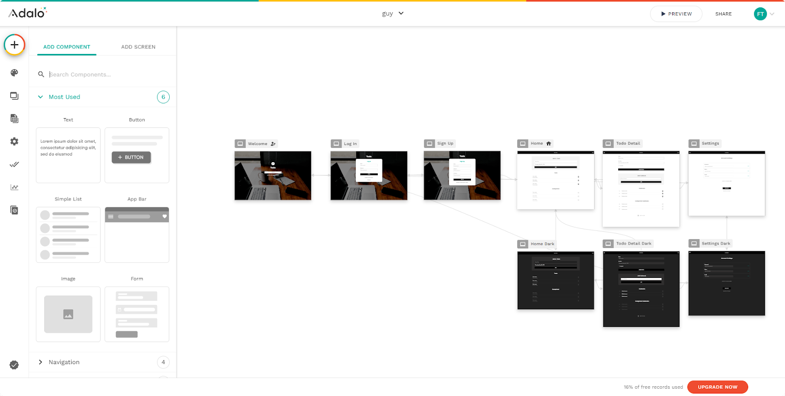 Adalo intègre et gère des bases de données et offre une plus grande flexibilité dans la construction, la conception et le lancement de votre processus de développement d'applications. Bien que son éditeur visuel soit un constructeur intuitif par glisser-déposer, la courbe d'apprentissage d'Adalo est plus complexe que celle de Glide.
