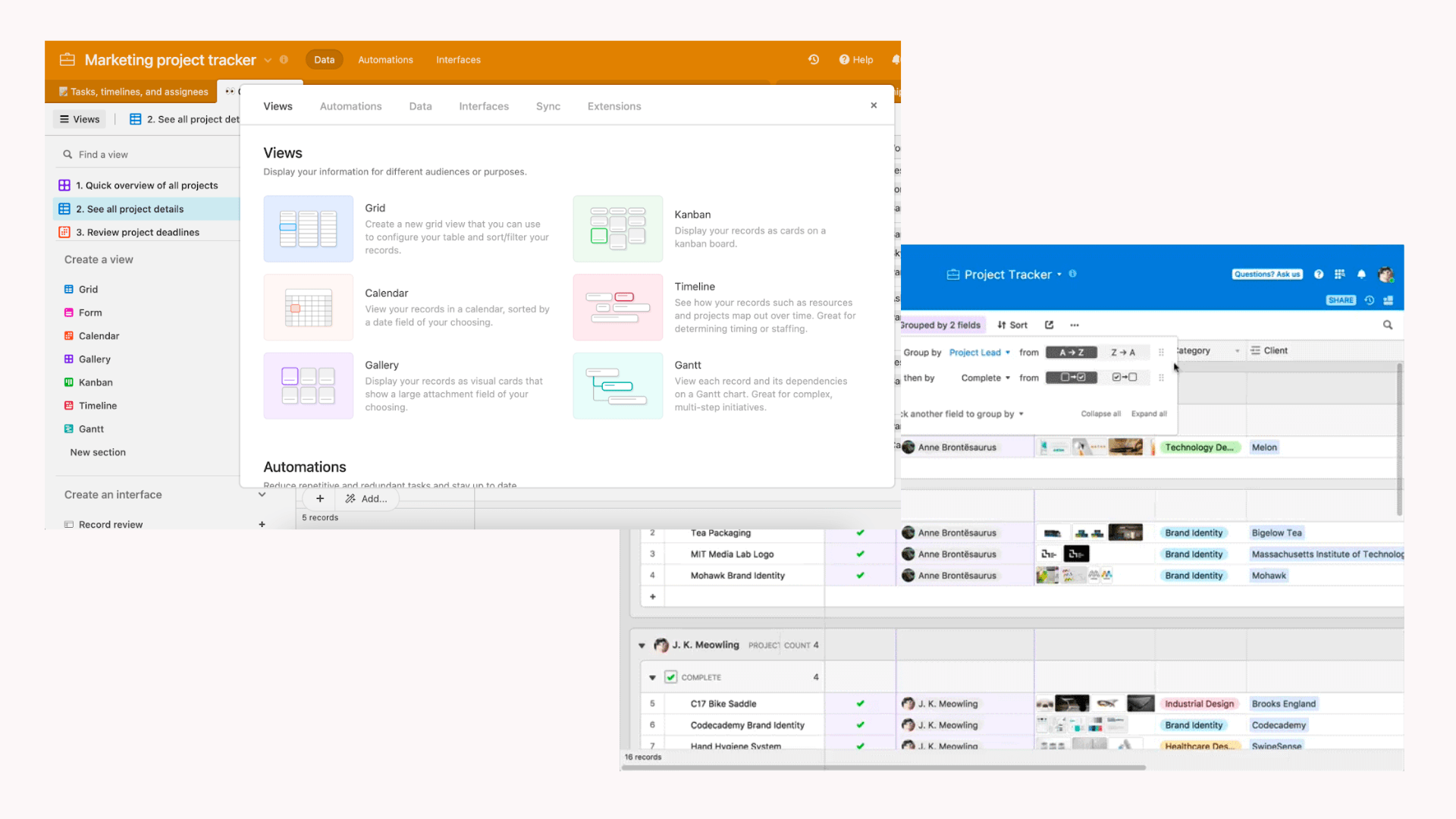 Build your base from the new “Add more” button. This button takes you to a page that groups all of Airtable's types and functionality. Whether it's a view, automation, extension, or data, you can now see all of these options easily.