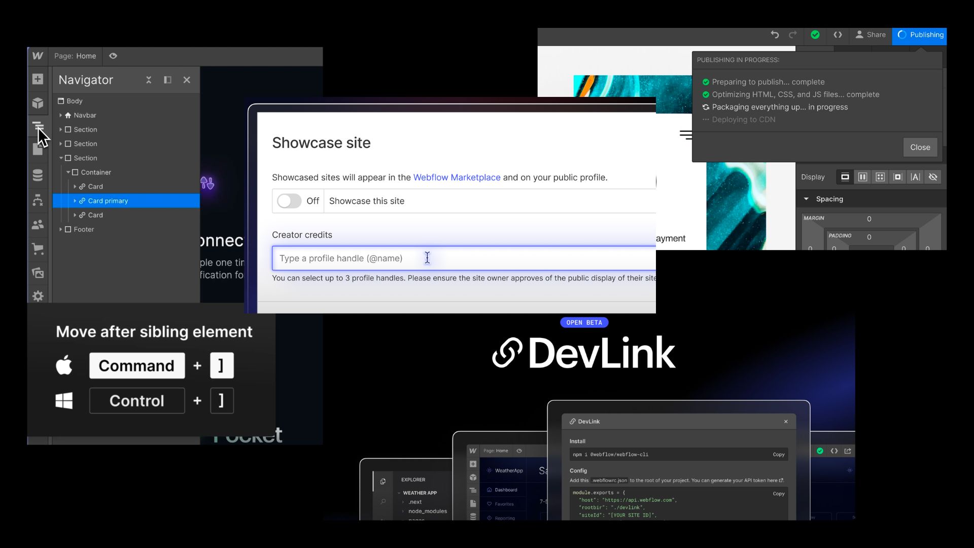 - Nouveaux raccourcis clavier pour le déplacement d'éléments : Les utilisateurs peuvent désormais déplacer des éléments dans le Webflow canvas plus efficacement en utilisant des raccourcis clavier spécifiques.
