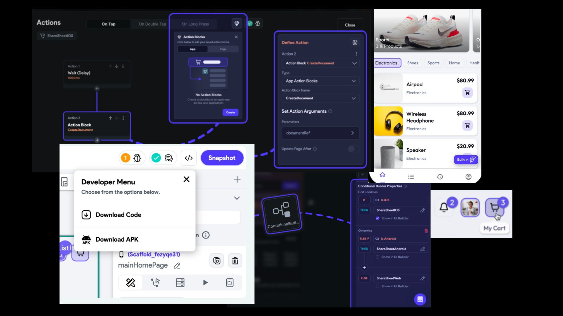 - Reusable Action Blocks vous permettent de créer des séquences d'actions réutilisables dans votre application, ce qui simplifie la gestion des changements et évite les erreurs.