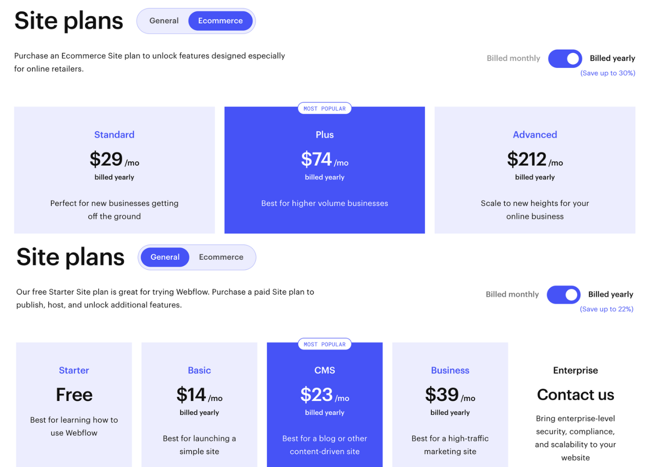 A première vue, les options tarifaires de Webflow semblent plus élevées que celles de Framer. Cependant, vous devez toujours tenir compte de vos besoins et des raisons qui vous poussent à souscrire à l'un de ces abonnements.