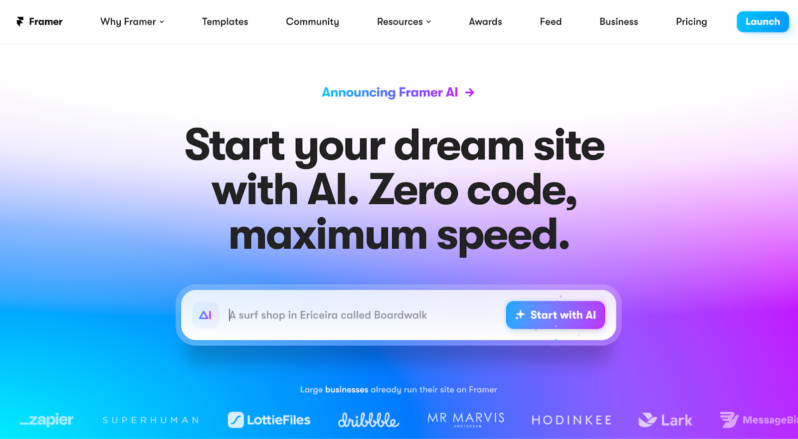 Framer est un outil no code puissant créé en 2015. Il est largement reconnu et recommandé pour sa capacité à gérer correctement votre site web avec des design interactifs et des animations complexes. Même Facebook, Google et d'autres plateformes ont eu recours à leur solution. Son éditeur de code intégré vous permet de designer le prototype de votre site web tout en le rendant dynamique et interactif.
