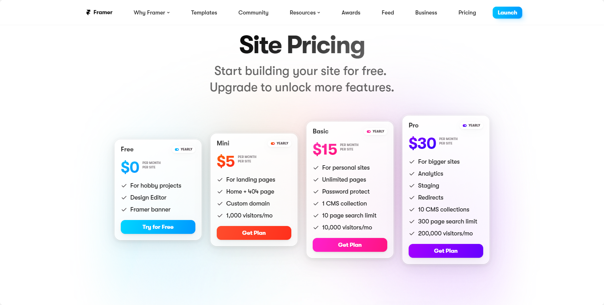 Framer propose différents forfaits pour répondre à vos besoins. La formule gratuite convient aux projets de Test ou d'entrainement, tandis que la formule mini est idéale pour les pages d'atterrissage à 5 $/mois. L'offre Basic convient aux sites personnels à 15 $/mois, et l 'offre Pro convient aux sites plus importants à 25 $/mois.