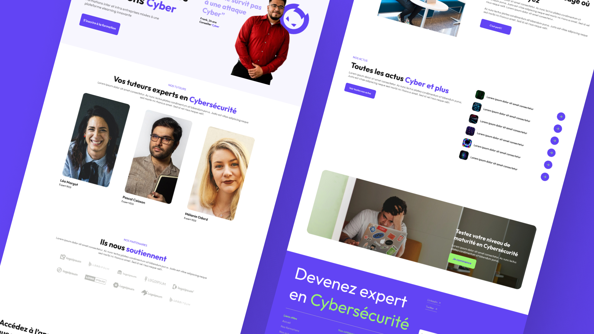 Après plusieurs itérations, nous avons opté pour la version ci-dessous. Au-delà de l'interface utilisateur que nous avons créée, nous avons intensifié les couleurs choisies avec une nuance de violet plus riche et avons décidé de l'associer à un vert flash. Cette combinaison de couleurs, associée à un design dit "corporate", crée une identité atypique et mémorable.
